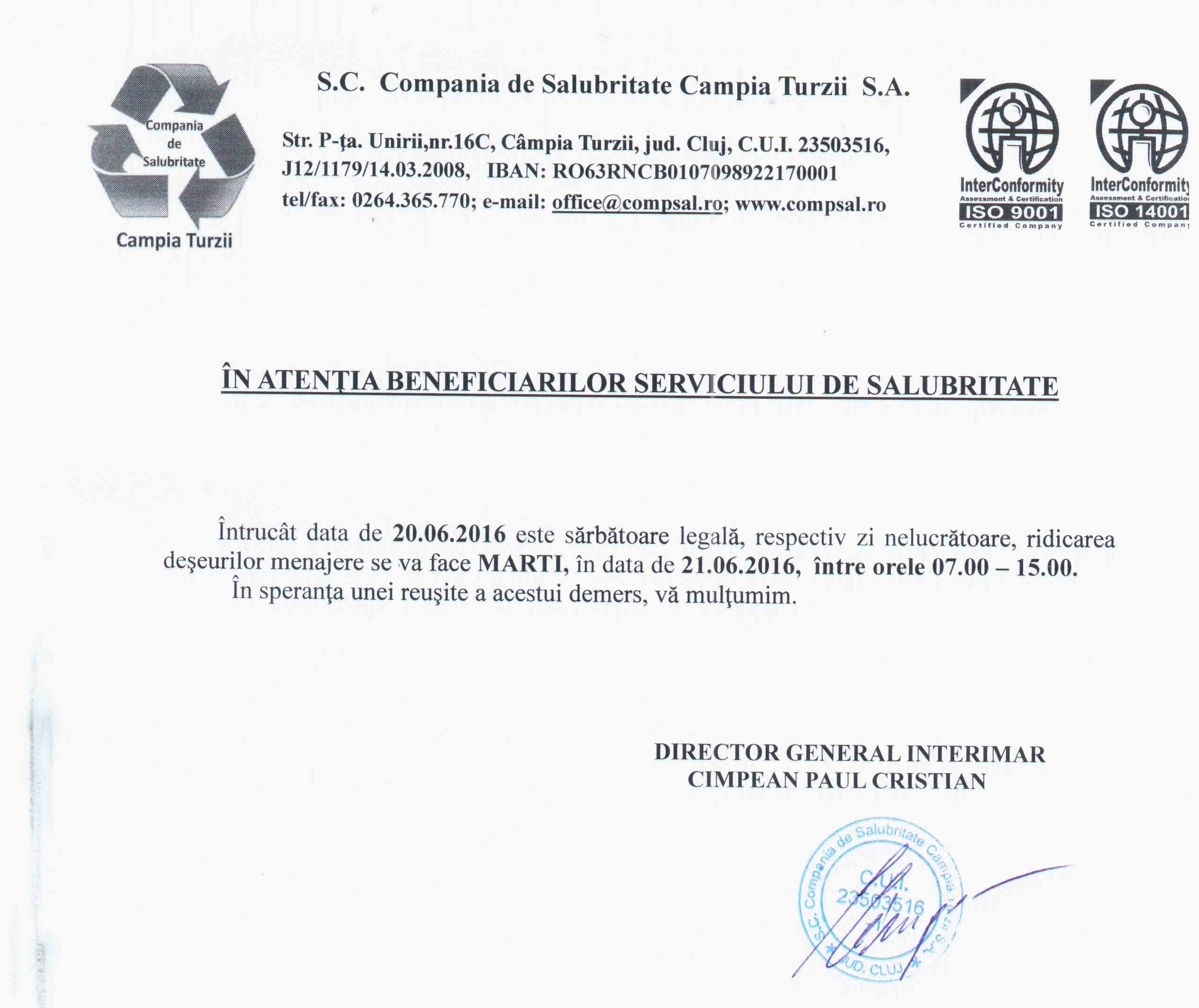 Întrucât data de 20.06.2016 este sărbătoare legală, respectiv zi nelucrătoare, ridicarea deşeurilor menajere se va face MARTI, în data de 21.06.2016, între orele 07.00 - 15.00.