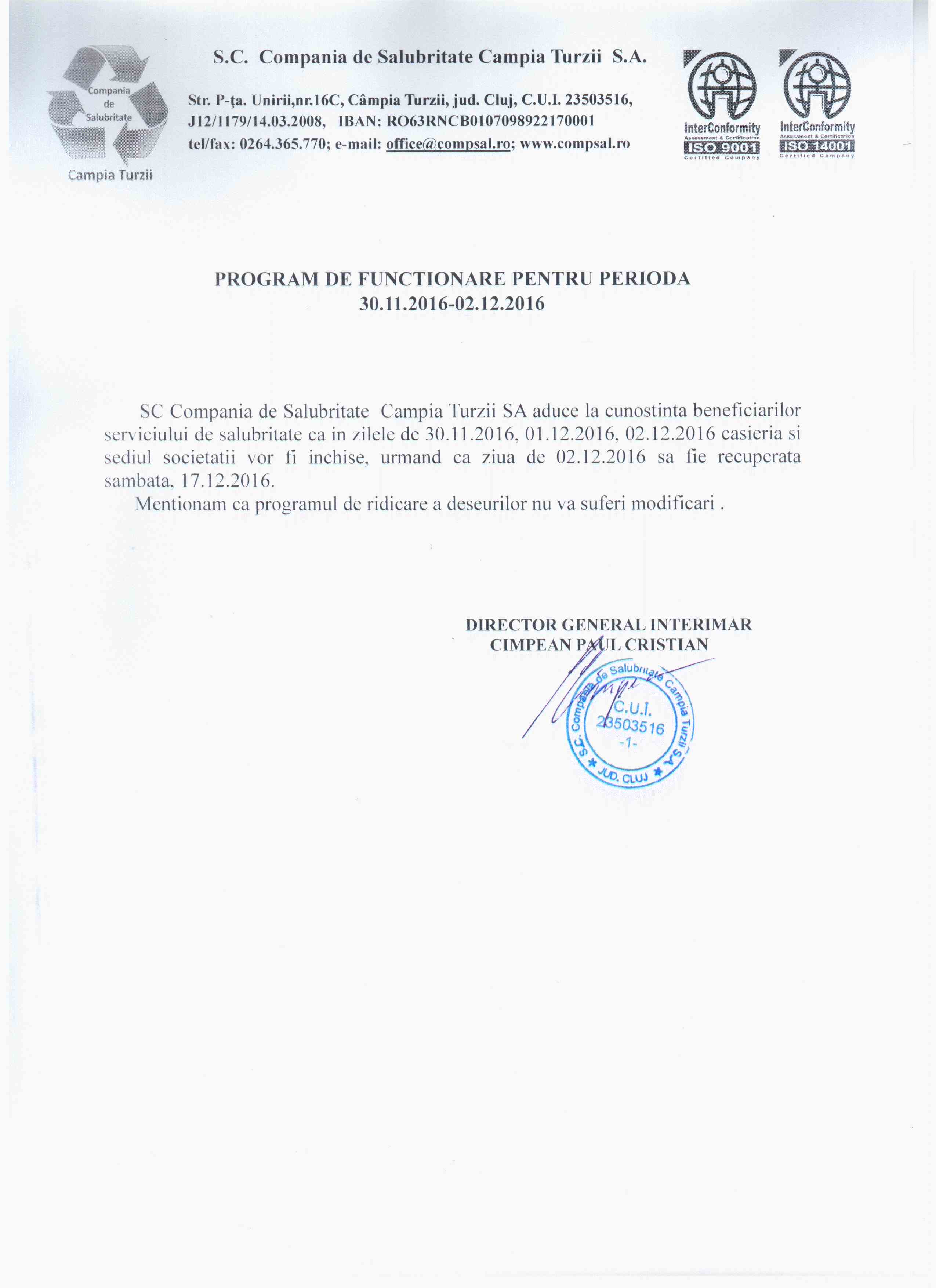SC Compania de Salubritate Campia Turzii SA aduce la cunostinta beneficiarilor serviciului de salubritate ca in zilele de 30.11.2016, 01.12.2016, 02.12.2016 casieria si sediul societatii vor fi inchise, urmand ca ziua de 02.12.2016 sa fie recuperata sambata, 17.12.2016.